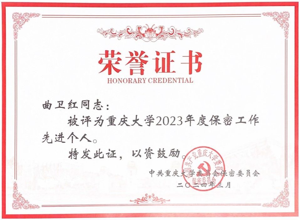 近日,学校印发了《关于表彰成人影视片 2023年度保密工作先进集体和先进个人的通报》(重大委密〔2024〕8号), 成人影视片 兼职保密员曲卫红同志荣获成人影视片 2023年度保密工作先进个人称号。