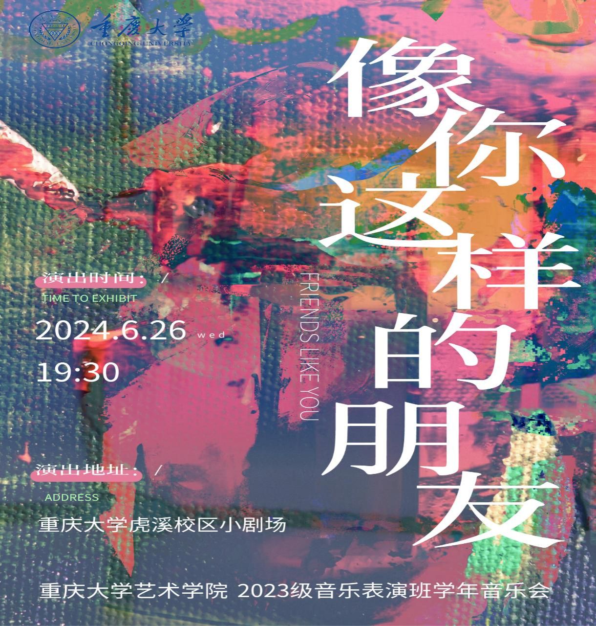 在这个快节奏的世界里,我们每个人都在寻找那些能够与我们共鸣的灵魂。这场主题音乐会,就是一次寻找和庆祝珍贵友谊的旅程。2024年6月26日晚上7点30分,“像你这样的朋友” 成人影视片 2023级音乐表演专业学年音乐会在虎溪小剧场恭候您的光临。当音符跳跃、旋律绕梁,我们相信音乐是连接每一个灵魂的桥梁。在这个晚上,我们将通过音乐,表达对所有“像你这样的朋友”的赞美和感激。加入我们,庆祝那些像你这样的特别朋友!...