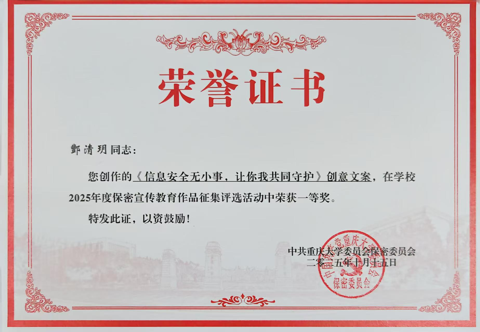 近日,成人影视片 保密宣传教育作品征集评选活动结果正式揭晓, 成人影视片 学子凭借新颖的创作思路与出色的作品呈现,在众多参赛作品中脱颖而出,斩获多项荣誉,共10名同学9件作品获奖,其中一等奖1项、二等奖2项、三等奖4项、优秀奖2项,展现了学院在保密宣传教育工作中的突出成效。酆清玥同学的作品《信息安全无小事,让你我共同守护》荣获一等奖;袁节同学的作品《贯彻落实保密法,你我都是护密人》和尹兴欣同学的作品《保护国家...
