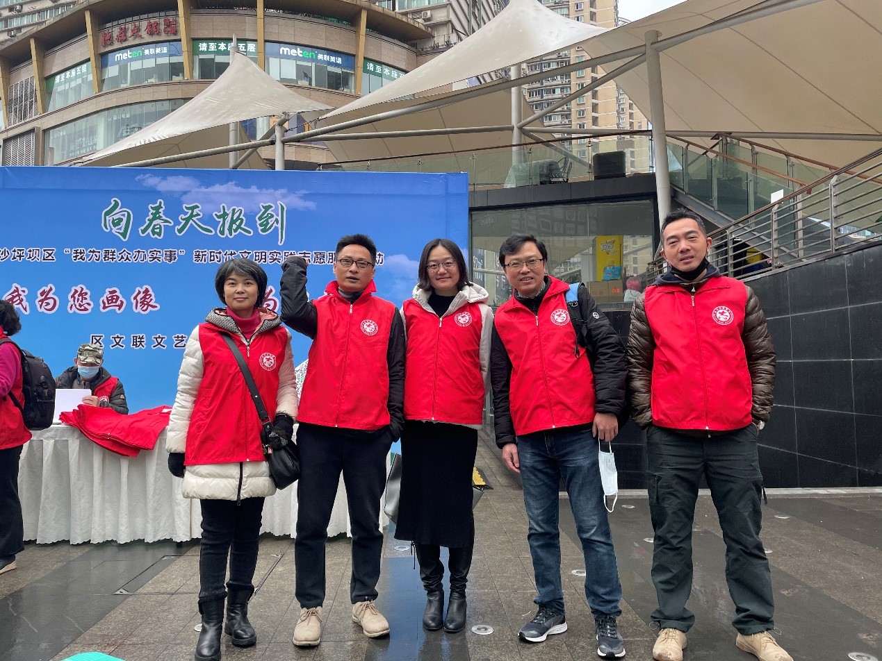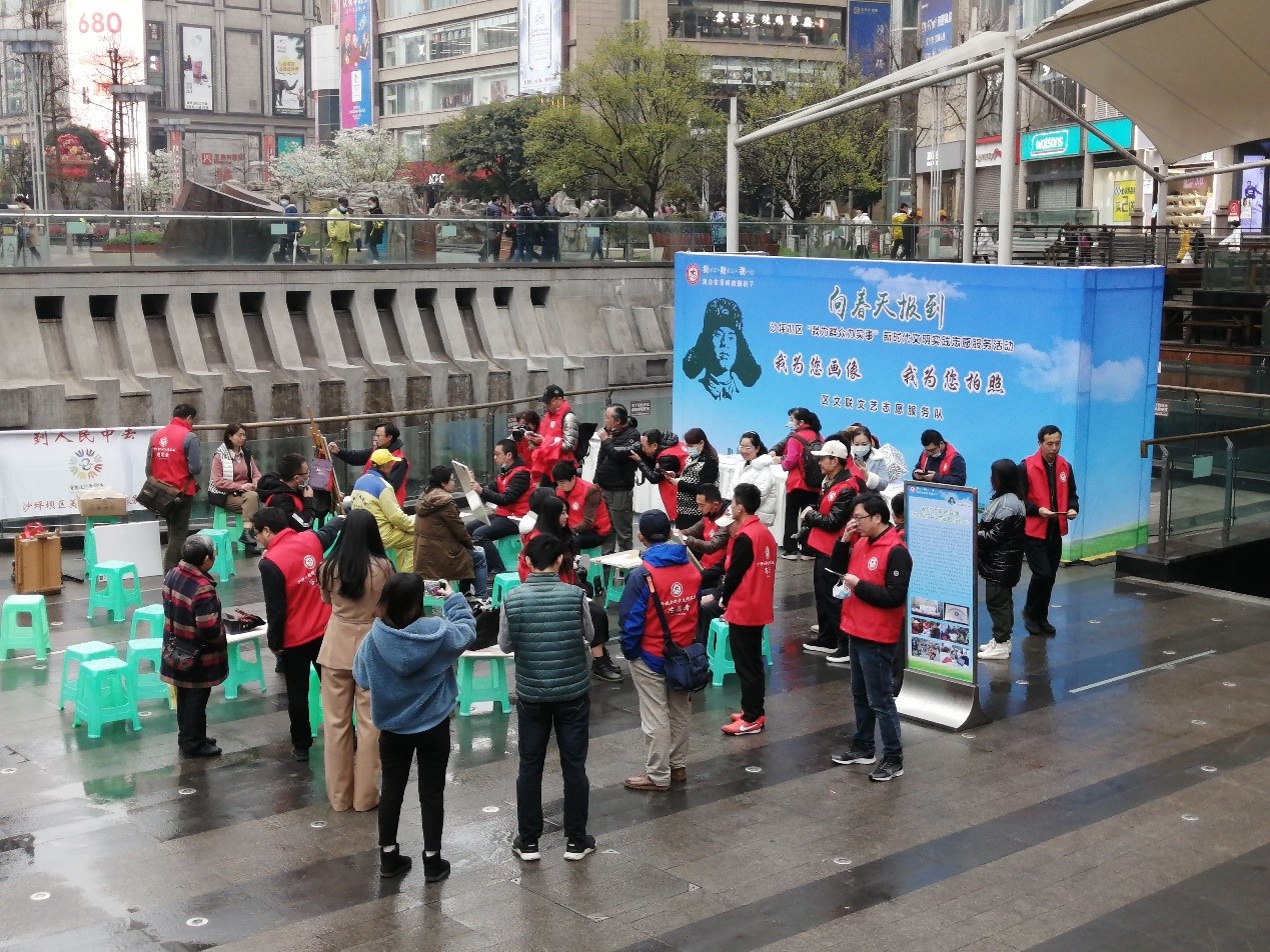 美术学系专任教师党支部深入基层,为市民群众送温暖,积极配合沙坪坝美术家协会,开展了“我为您画像·我为您拍照”文艺志愿服务。这次活动得到沙坪坝区区委领导的支持,并到现场看望了艺术家们。