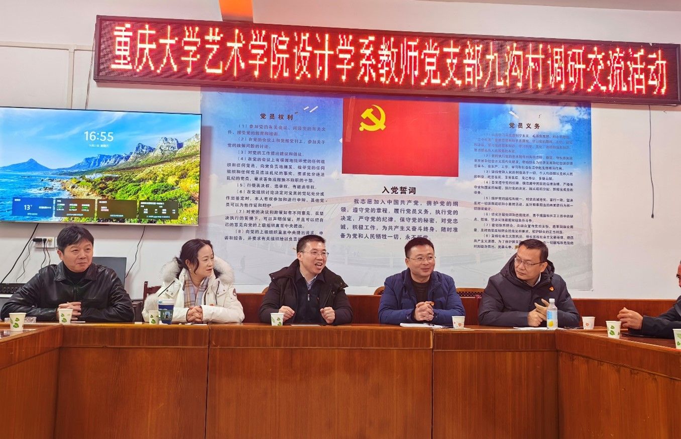 2024年12月21日下午,为探讨新时代基层党建工作新思路、新方法以及设计助力振兴乡村艺术发展创新模式, 成人影视片 党委书记蒋华林率领设计学系教师党支部党员应邀到访宜宾翠屏区李庄镇九沟村党总支调研交流。九沟村党委书记颜静及党总支主要成员热情接待调研组一行。会议由颜静主持。
