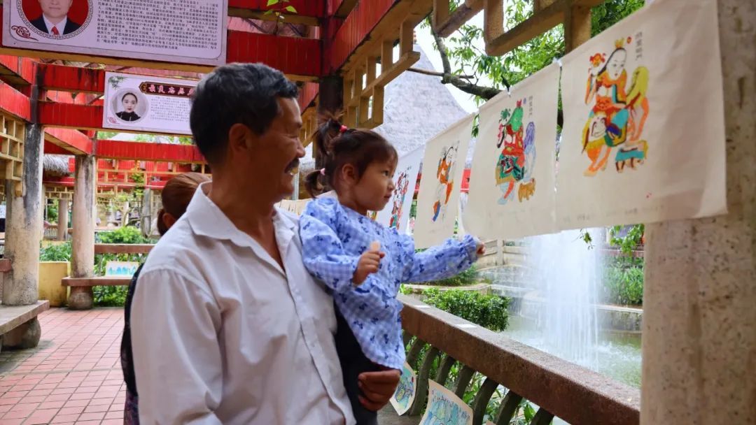 活动现场,一幅幅多彩画作整齐有序的排列在古亭长廊两侧,有师生共绘长卷、国画花鸟、特色版画、民族纹饰、我的家乡风景等作品,并按照作品元素分别设置了国画体验区、版画区、民族元素区、创意区等不同区域进行展示,方便群众参观。此次参展作品形式多样、创意满满,引得参观群众连连称赞,在每一幅画作上也或多或少“结满”了小印章,现场一片热闹。
