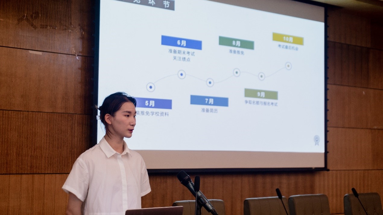 舞蹈表演专业的周温静围绕推免环节、择校考虑、应试技巧三方面做了分享。她指出,大家要把握好时间节点,7月准备简历、8月准备报名、9月冲刺推免。她强调,要始终明白绩点才是保研关键要素,同时积极参加各类竞赛、项目等。她指出,保研过程中应遵循“稳、专、异”,一定要有稳妥保底的学校,务必明确专业方向,注意不同院校填报志愿的差异。最后她说,在应试时要是灵活反应、沉着冷静、逻辑清晰。