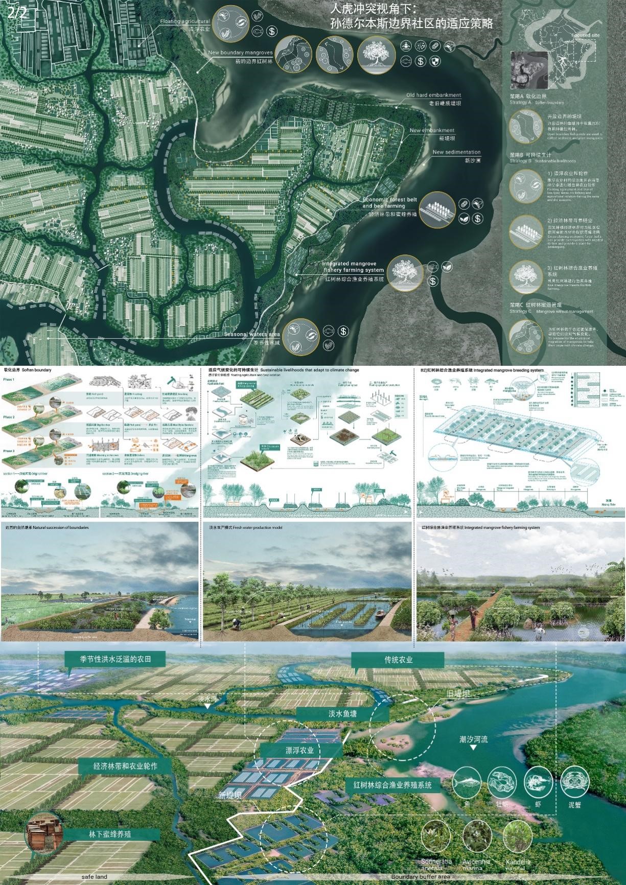 设计学系环境设计专业在教学中注重扎实学生基本功、开拓国际视野、“教、学双轨同步”同时,注重对学生跨界融合能力的培养,鼓励学生跨学科交流融合,开阔学术视野,“以赛促学、以赛督教”,取得了较好的效果。作品从气候变化所加剧的社会问题出发,融合多学科知识,从景观学科角度给出了可行的解决答案。