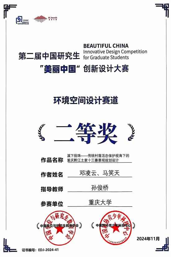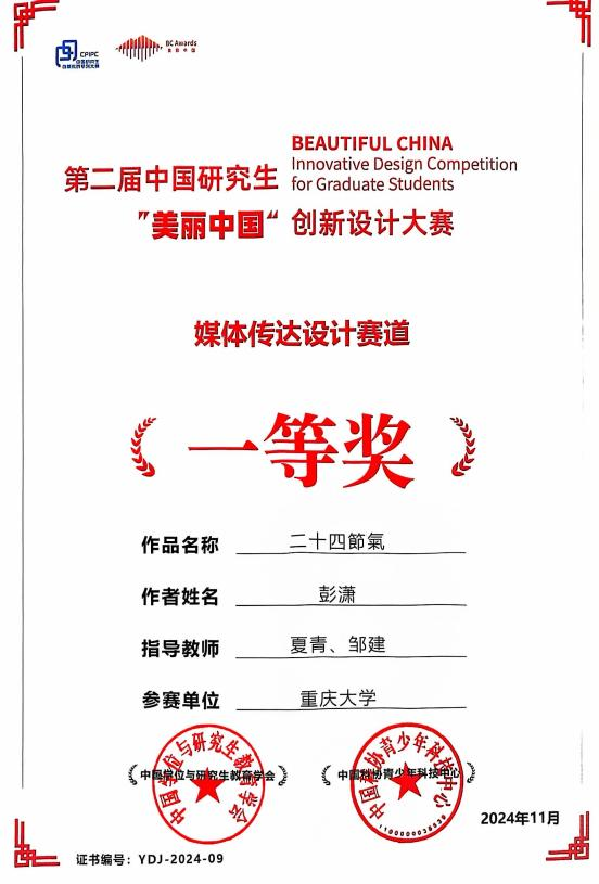 设计学系研究生在本次大赛中取得了优异成绩。在“媒体传达设计”赛道中,彭潇作品《二十四節氣》获得一等奖(指导教师:夏青、邹建);在“环境空间设计”赛道中,邓凌云、马笑天合作作品《溪下拾珠——传统村落活态保护视角下的重庆黔江土家十三寨景观规划设计》获得二等奖(指导老师:孙俊桥)。
