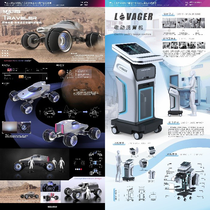 产品设计作品:2023届本、硕毕业设计主题聚焦于“重思·重塑”。“重”,既包含了新的时代语境下产品设计的“重庆之声”与“重大回应”,又表达了“未来设计师”对社会、科技、文化的重新审视与创新意识;“思”,思考在科技交融新态势、信息网络新类型、生活学习工作新方式对设计提出新要求;“塑”,通过反思“人—物—环境”,建构“人—自然—文化—智能—科技—生活”的新型互动关系。围绕科技生活、康复医疗、智能文创三个专题的70余件作品探索解决问题的路径,关注生活中的家居环境、交通出行、智能科技,面向主动健康进行了居家康养、全民健康,思考“非遗”技艺传承、优秀传统文化与现代生活的智能化文化产品设计的新实践。