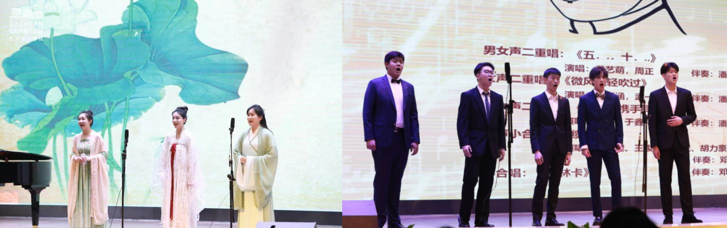 随后,音乐系师生们为学生们演绎了中外艺术歌曲和民歌,中国古典诗词歌曲《长相知》《七步诗》,以及莫扎特歌剧《唐璜》、《费加罗的婚礼》等片断等,通过独唱、重唱、合唱等多种演唱形式,展现了声乐艺术的独特魅力。尤其是喻思言和巴川量子学校老师、优秀校友郭珍琦演唱的《一杯美酒》,苏勤老师和巴川量子学校老师余鑫演绎歌剧《唐璜》选段获得满堂喝彩。最后音乐会在爱国主义歌曲《我和我的祖国》中结束。