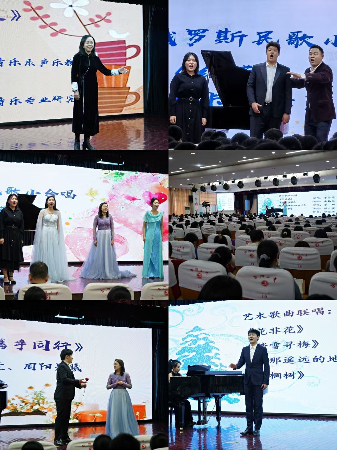 下午,2点30分“中外经典声乐作品专场”音乐会如期举行。从中国艺术歌曲到欧洲艺术歌曲与咏叹调;中国民族歌剧选段回归中国古诗词系列。最后台上台下共同演唱《我和我的祖国》的歌声中结束。两场音乐会收获了师生们的高度赞赏和热烈的掌声。