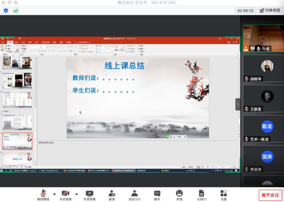 视觉传达系况成泉老师分享了雨课堂和钉钉课堂的使用技巧和经验,雨课堂主要专注于高校线上线下结合式的专业教学;钉钉则是建群式的团队管理教学。此两个平台不仅可以直播讲课、分享屏幕、外挂顶部摄像头,把教学的全过程都记录下来了,为线上教学提供了很大便利,为学生回看、重复看提供了学习便利。