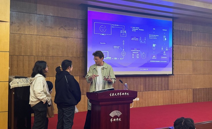 在问答环节,与会师生就“AI时代下设计师所扮演的角色”、“人机协作机制”、“AI对未来设计行业及社会发展的影响”等热点问题展开讨论。João结合其实践案例,为设计教育转型提供建设性意见,现场交流氛围热烈、友好。