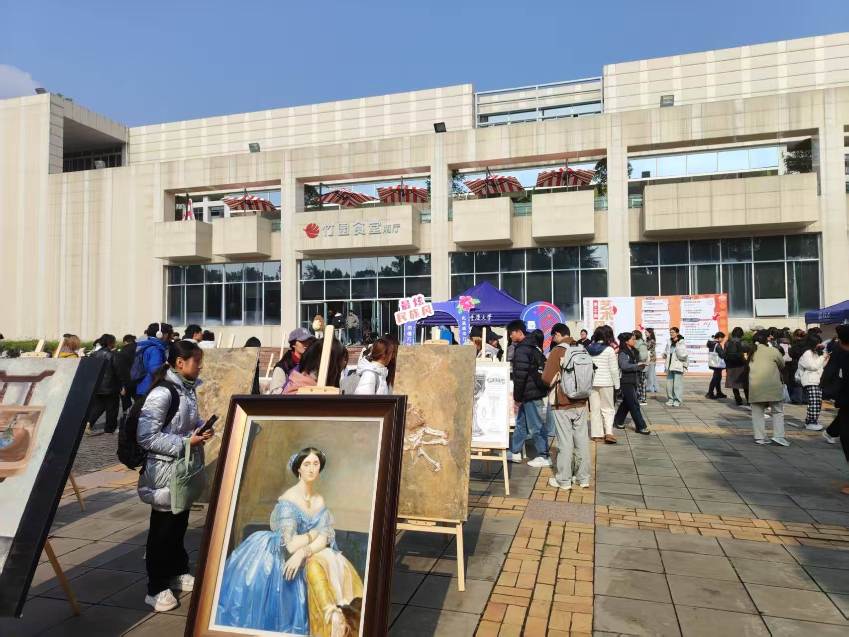 本届“艺术风行”系列活动的重头戏——“美育体验周”将于11月24日至28日在虎溪校园进行,期间推出六场沉浸式活动:音乐舞蹈快闪及现场教学、非遗手作体验、陶艺创作工坊、美学讲座、艺术作品展览等。一食堂南广场两侧快闪舞台每日中午轮番上演“即兴点位”演出;展区集中展示40幅学院学生最新创作作品,涵盖素描、国画、油画、摄影等,吸引大批师生驻足拍照、互动打卡。开幕首日现场参与师生超1000人次。