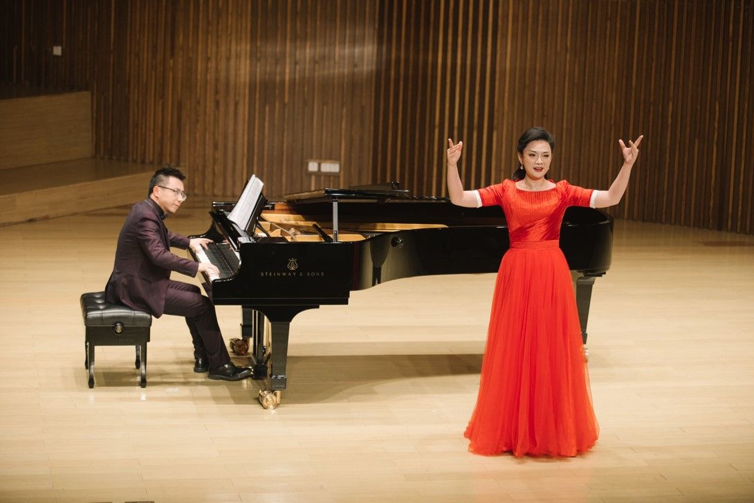 随后,周祖权和知名抒情女高音歌唱家、 成人影视片 音乐系青年声乐教师袁筱璇共同为观众带来了中国古诗词作品《蝶恋花》和我国民族歌剧选段《月亮,快快升起》。