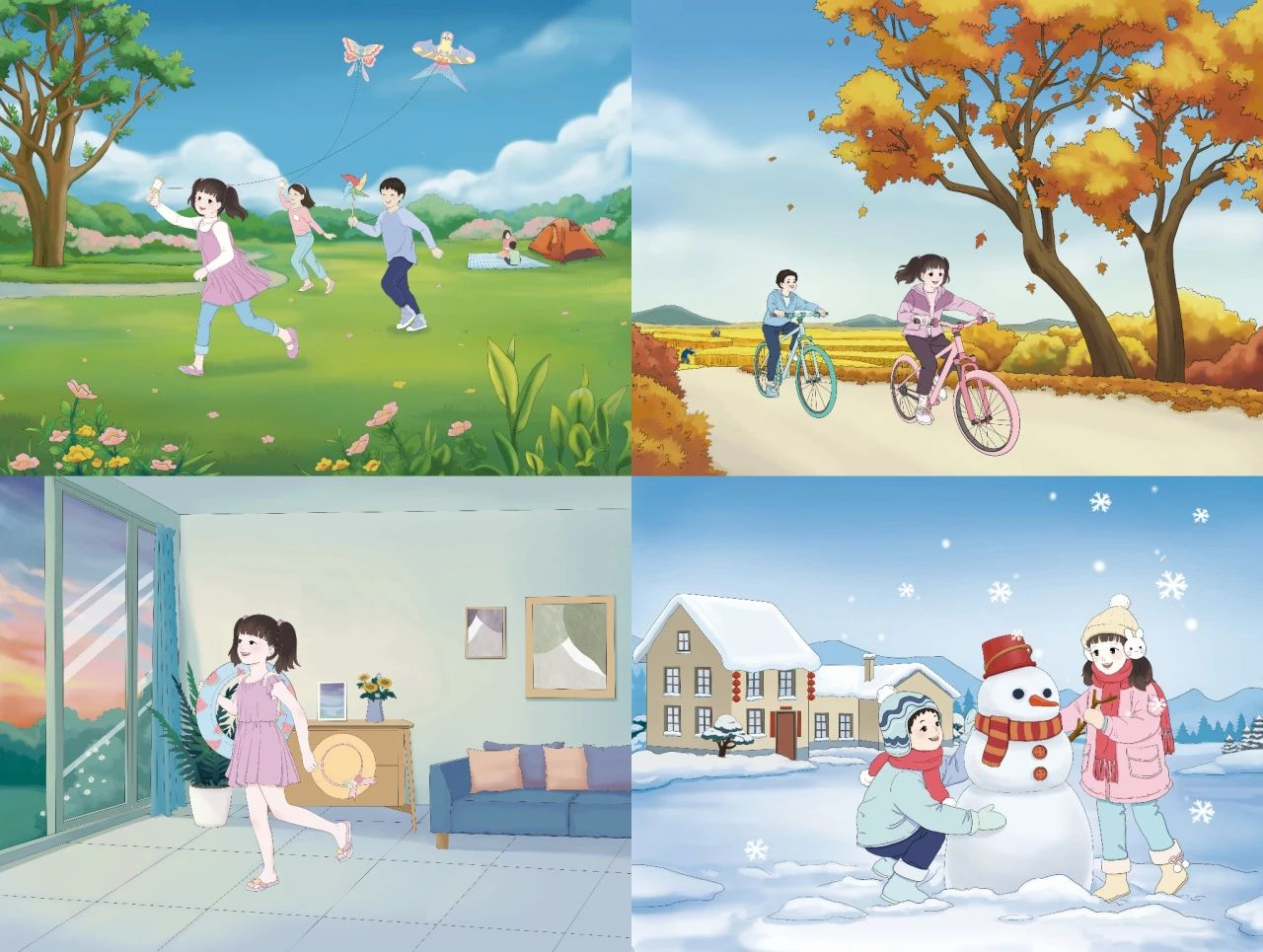 2024年重大版小学英语教材插图创作,将艺术之美融入教材之中,努力展现新时代中国少年阳光快乐、健康向上的精神面貌;遵循儿童认知与身心发展规律,贴近现代生活;人物形象契合课文、活泼生动,风格清新雅致、美观大方,色彩丰富和谐、层次鲜明。