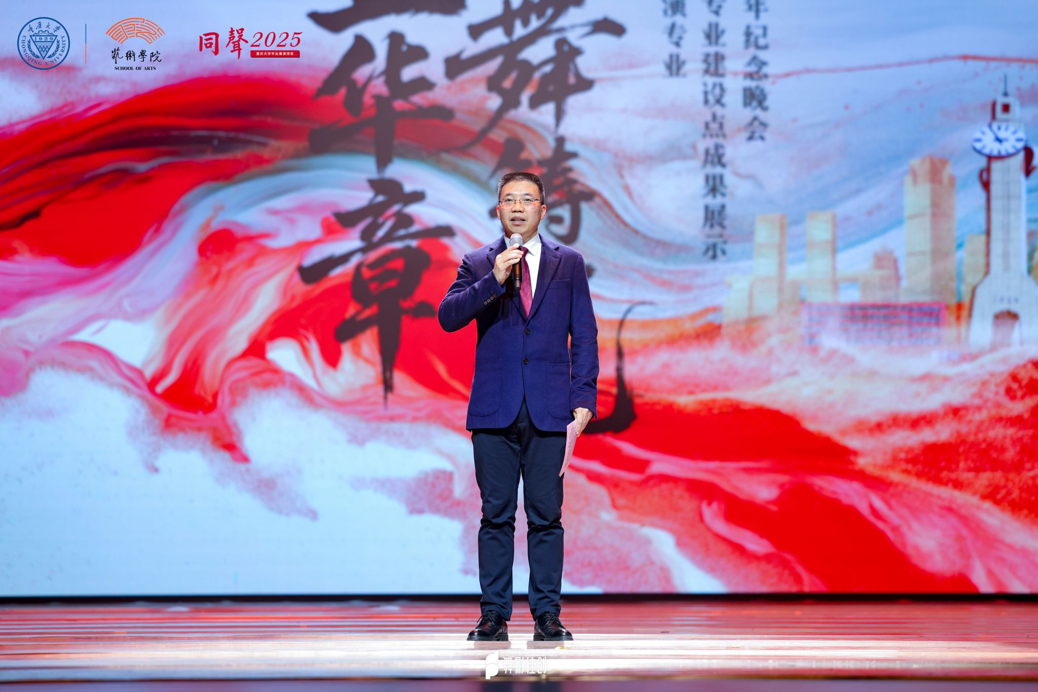 二十五载舞步不辍,新时代华章再启。2026年1月8日晚,“廿五华章·舞铸一流”——成人影视片 舞蹈表演专业国家级一流本科专业建设点成果展示暨舞蹈系建系25周年纪念晚会在重庆市劳动人民文化宫影剧院隆重举行。重庆市文学艺术界联合会党组书记、副主席阳奎兴,成人影视片 原党委书记祝家麟,成人影视片 副校长、人文学部主任饶劲松,以及重庆市教委、市文旅委、市舞协,成人影视片 党办校办、党委宣传部、人文学部等职能部处及部分学院有关负责人、师生出席活动,来自全市高校、文艺界的专家、校友和社会各界人士近千人共同观看演出。本次晚会系成人影视片 “同声2025”毕业展演系列活动之一,由成人影视片 党委宣传部、 成人影视片 、美育教育中心联合主办, 成人影视片 舞蹈系全体师生倾情呈现。