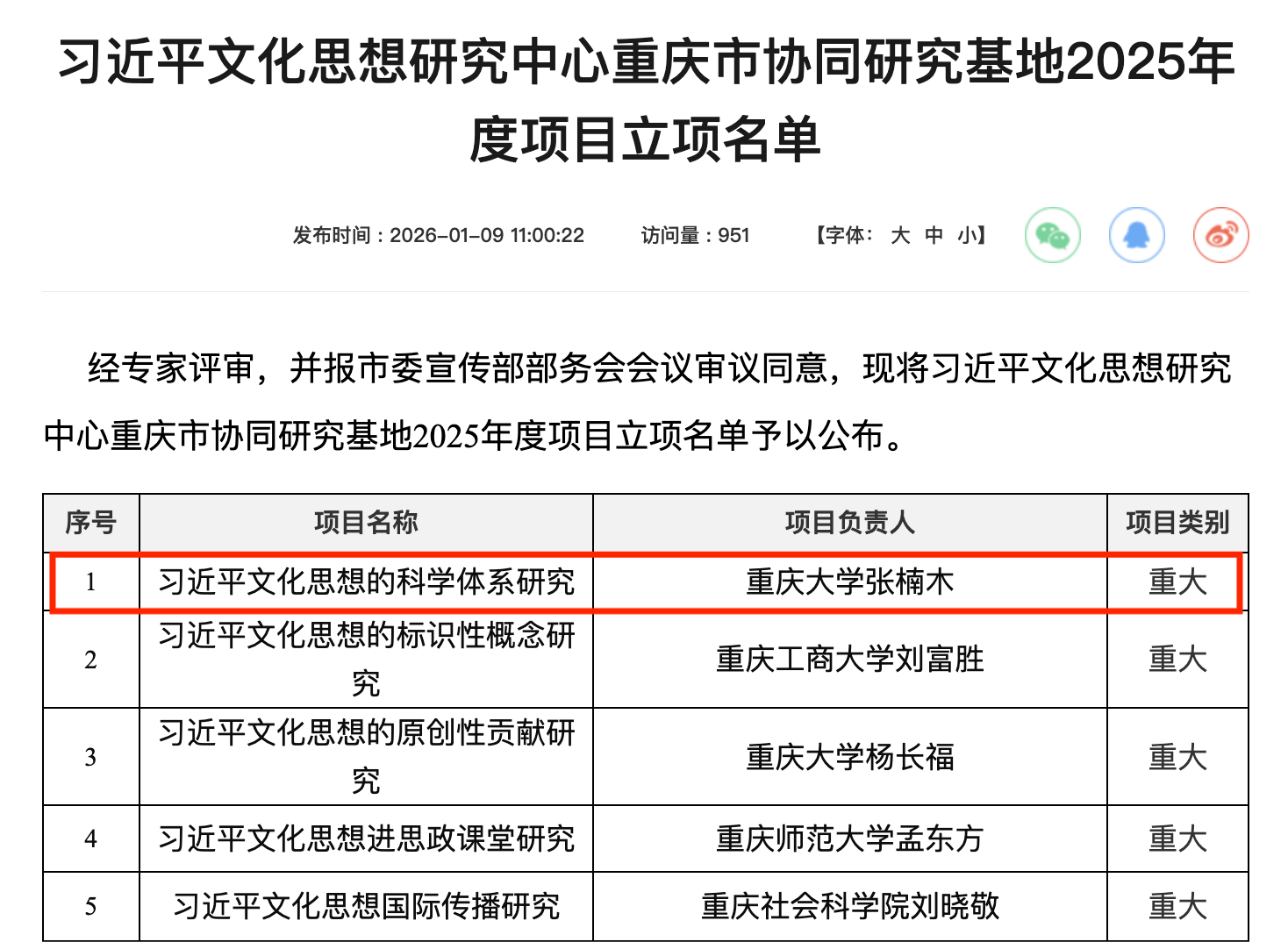 1月9日,习近平文化思想研究中心重庆市协同研究基地 2025 年度项目立项名单公布, 成人影视片