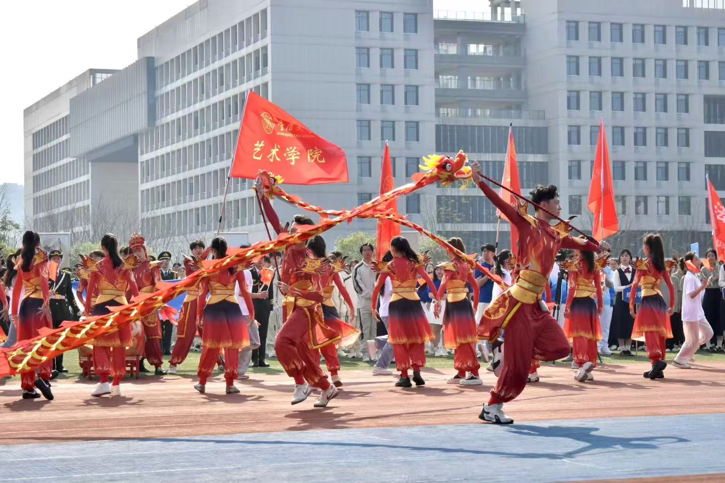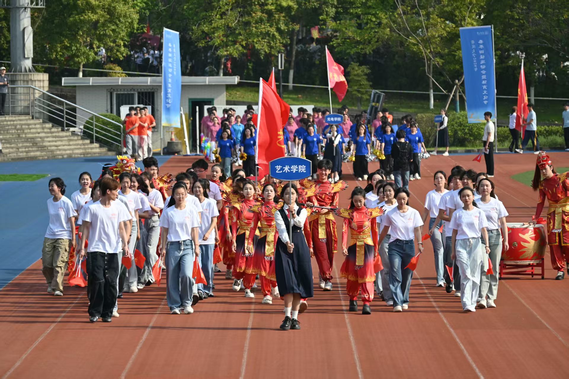 4月10日上午的运动会开幕式上,学院表演方阵紧扣国家“十五五”规划宏伟蓝图与“百年新重大”建设重大命题,通过彩带龙、小红旗与《赛马曲》的完美融合,生动诠释了新时代艺术学子的蓬勃朝气与使命担当。此次方阵表演既是对党和国家的深情告白,更是全体艺术人逐梦前行、不负韶华的铿锵誓言。
