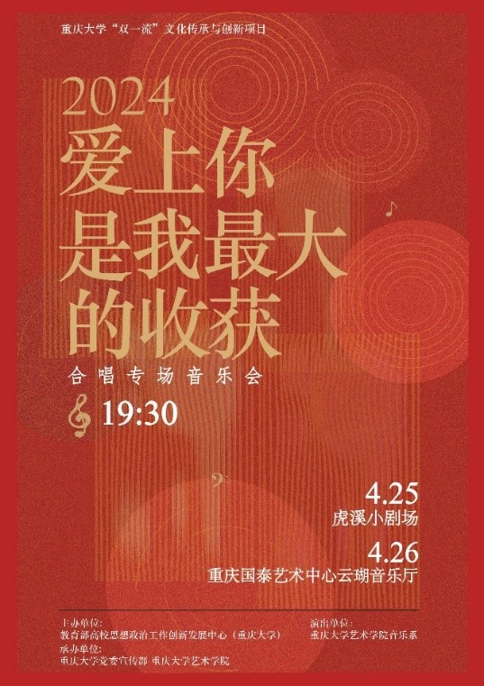 虎溪校区小剧场(免门票入场)、4月26日在重庆国泰艺术中心云瑚音乐厅举办。