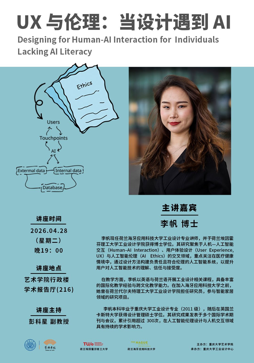 本次讲座主讲人李帆博士,在荷兰埃因霍芬理工大学工业设计学院获得博士学位,现任荷兰海牙应用科技大学工业设计专业讲师。其研究聚焦于人机—人工智能交互(Human-AI Interaction)、用户体验设计(User Experience, UX)与人工智能伦理(AI Ethics)的交叉领域,重点关注在医疗健康等情境下,通过设计方法实现负责任且符合伦理的人工智能系统,以提升用户对人工智能技术的理解、信任与接受度。她同时具有丰富的国际化教学与跨文化教育经验,曾在荷兰代尔夫特理工大学工业设计学院担任研究员,参与智能家居领域相关研究项目。
