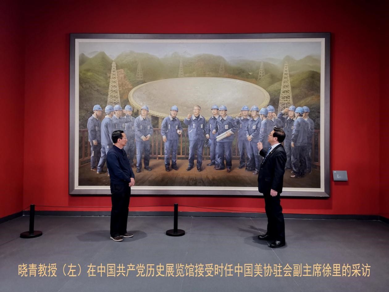 晓青教授创作的大型油画作品《天眼》获“纪念建党100周年国家重大历史题材大型美术创作工程”立项。《天眼》是以“人民科学家”南仁东事迹为创作主题,历时两年的艰辛创作,于2021年6月在中国共产党历史展览馆展出,并被收藏和永久性陈列。“纪念建党100周年国家重大历史题材大型美术创作工程”是新中国成立以来,组织规格最高、选题规模最大、参与创作人数最多的一次主题美术创作工程。由中宣部、中国文联、文化和旅游部、财政部共同主办,中国美协承办,组织各大美术学院、美术机构、30多个省市区美协和军队系统的3000多名美术工作者共同参与,审定结题200余件,其中122件作品在中国共产党历史展览馆陈列展出”。(引自中国美术家协会的公告)