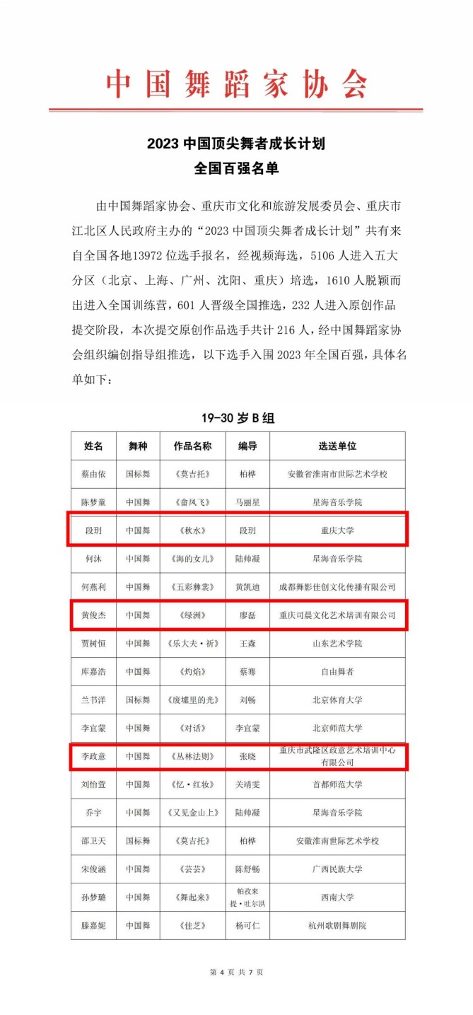 2023年9月14日,由中国舞蹈家协会发布了2023中国顶尖舞者成长计划全国百强名单, 成人影视片 舞蹈系青年教师段玥入围全国总推选后,脱颖而出,成功入围全国百强(19-30岁B组)。同时,学院2016级舞蹈系优秀毕业生李政意、黄俊杰也同步晋级全国百强。