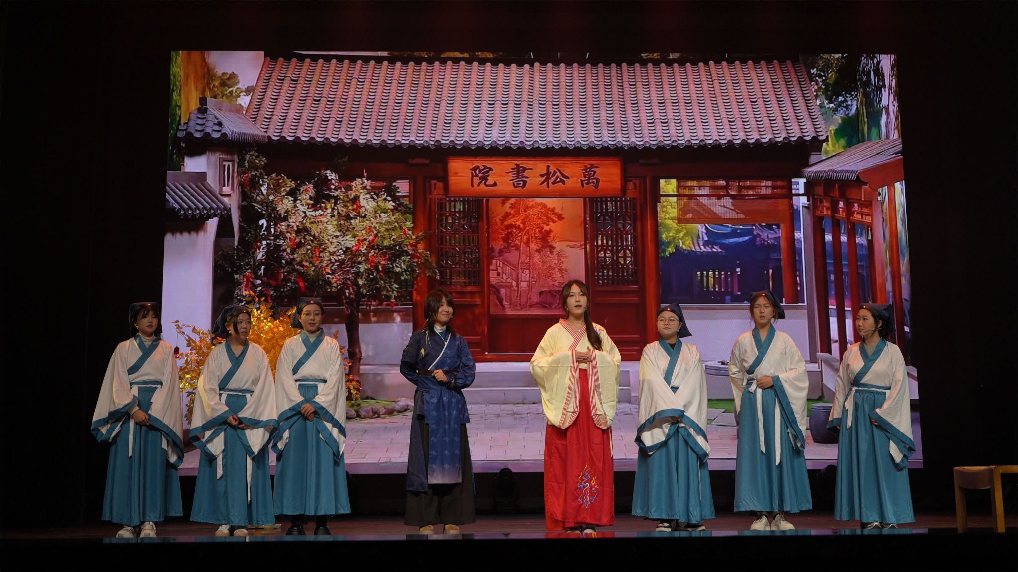 第三篇章《绘梦未来 马到成功》由配音五侠声演《Tough Love》开启,节目让声音戏剧直击心灵,呼吸、哽咽、怒吼皆入麦,全场只听声波却“看见”剧情;音乐系短剧《未来“是”》折叠时间,叩问青春未来式;美术学系现场挥毫+音乐《明天会更好》,奉献视听双重盛宴;设计学子爆笑小品《万松书院》以现代幽默对话古代书院,古人“之乎者也”撞上今人口语梗,青松墨韵里爆出阵阵笑声;林啸老师领衔2023级舞蹈女班压轴上演《峡江吟》,刚柔并济的肢体语言对话巴山渝水,裙裾似江雾翻涌,背脊如峰峦起伏,为晚会写下余韵悠长的艺术句号。