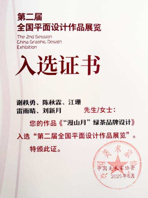 近日,由中国美术家协会主办的“第二届全国平面设计作品展览”评选结果揭晓, 成人影视片 设计学系副教授谢秩勇带领研究生团队创作的设计作品《“漫山月”绿茶品牌设计》凭借创新设计语言和传统文化表达,在品牌标志类作品中脱颖而出,成功入选。