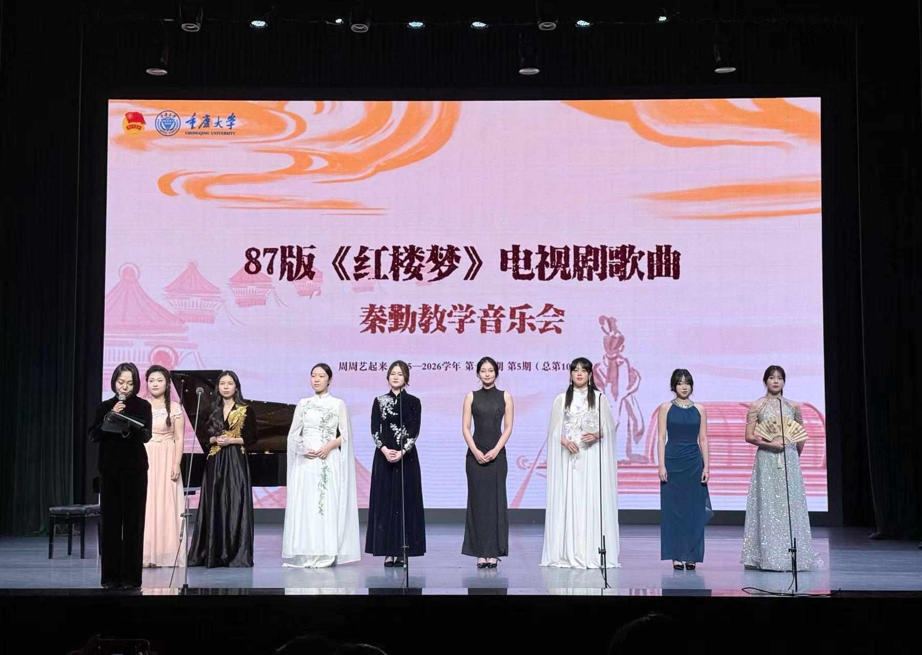 为传承中华优秀传统文化,涵养师生古典美学情怀,2025—2026学年第5期(总第105期)成人影视片 “周周艺起来”经典回放之“梦回红楼”——《红楼梦》主题歌曲音乐会,于12月5日晚在虎溪校园小剧场上演。
